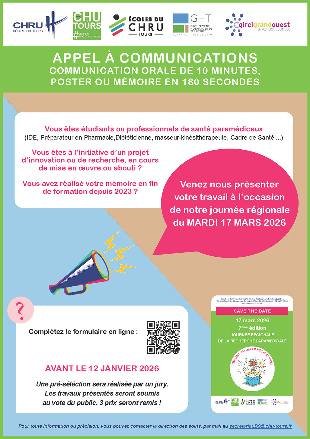 En amont de l’événement, l’appel à communications est dès à présent ouvert : étudiants et professionnels paramédicaux (IDE, préparateurs en pharmacie, diététiciens, masseurs-kinésithérapeutes, cadres…) sont invités à proposer une communication orale, un poster, ou une présentation de mémoire en 180 secondes.