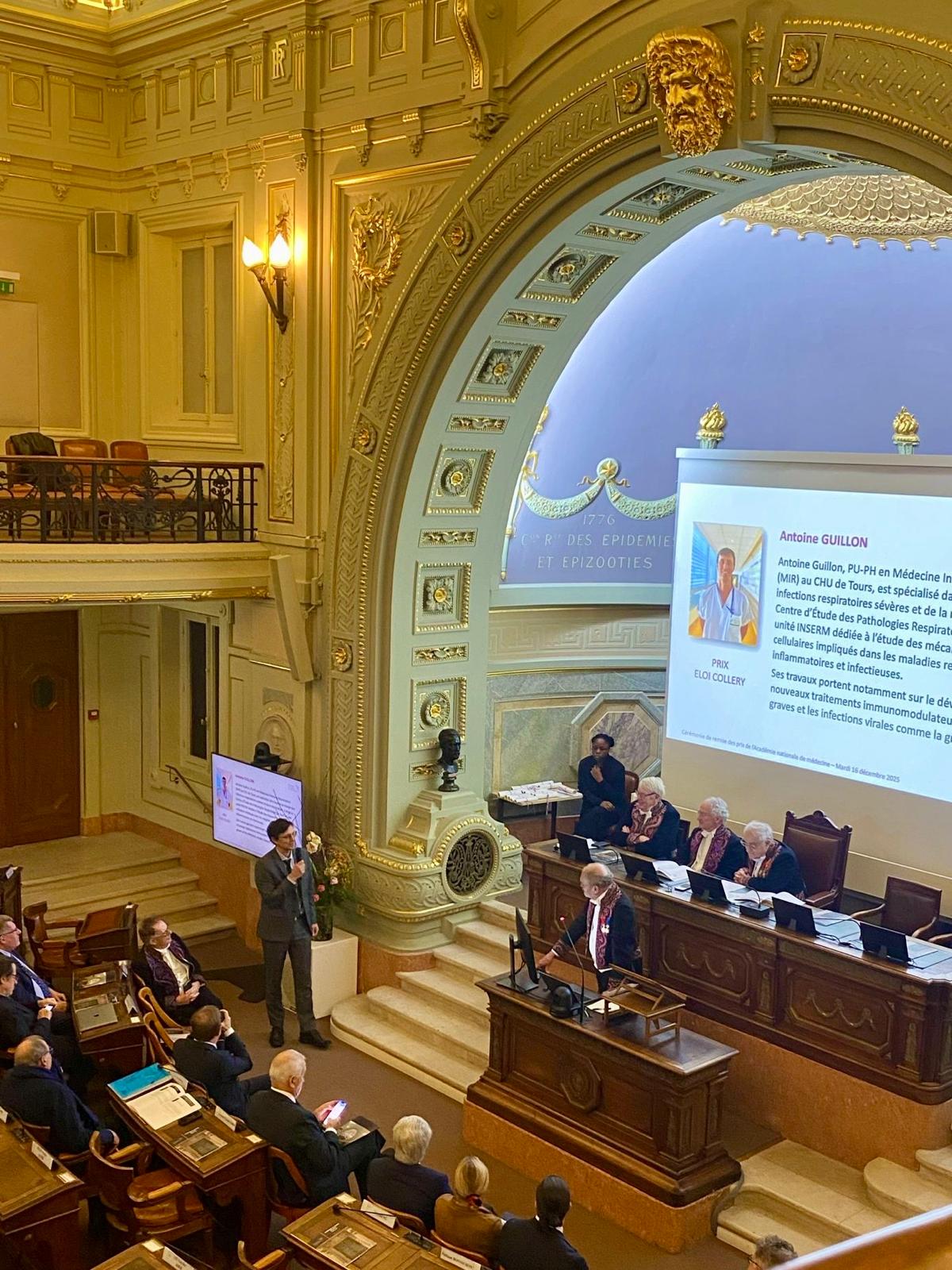 Le 16 décembre dernier, l’Académie de médecine a remis le Prix Eloi Collery au Professeur Antoine Guillon pour ses travaux de recherche des cinq dernières années, notamment sur la découverte des effets antigrippaux de certains métabolites du cycle de Krebs, ouvrant la voie à de nouvelles stratégies thérapeutiques.