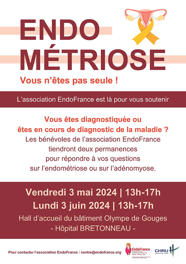Les bénévoles de l’association EndoFrance tiendront 2 permanences pour répondre aux questions sur l’endométriose et sur l’adénomyose.