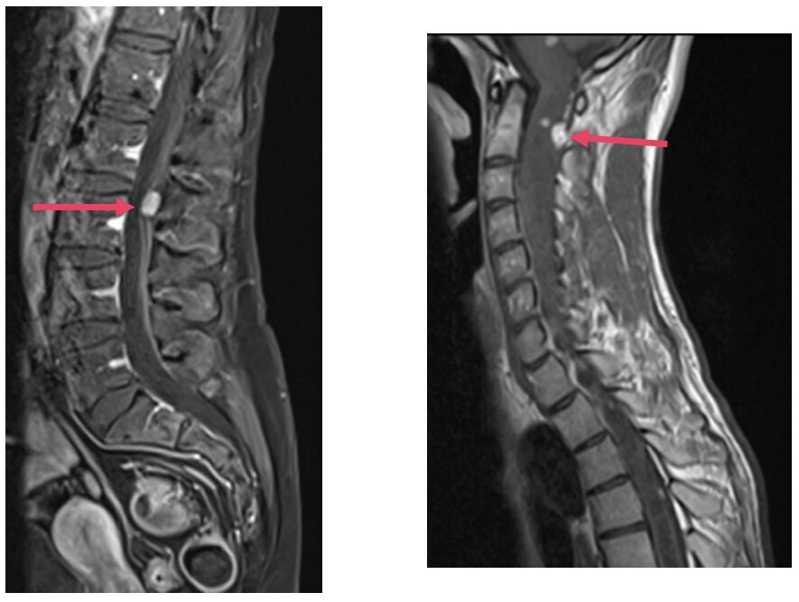 Les symptômes sont liés à la compression de la moelle épinière ou des nerfs : il peut exister des douleurs, un déficit sensitif ou une paralysie des bras et/ou des jambes en fonction de la localisation de la tumeur.