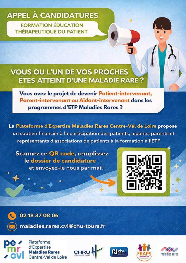 La Plateforme d’Expertise Maladies Rares Centre-Val de Loire (PEMR CVL), en partenariat avec la FRAPS Centre-Val de Loire, renouvelle pour la deuxième année consécutive son appel à candidatures pour la formation en Éducation Thérapeutique du Patient (ETP).
