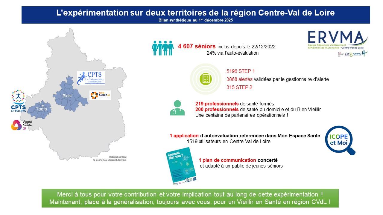 Sur la région Centre-Val de Loire, l’expérimentation est menée sur les territoires de la CPTS O’Tours (37) et de la CPTS La Salamandre (41). L’objectif principal de l’expérimentation est d’identifier les freins et les leviers du dispositif ICOPE pour ensuite l’étendre à plus grande échelle.